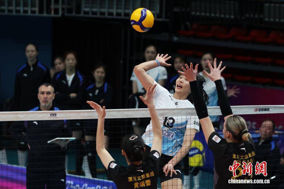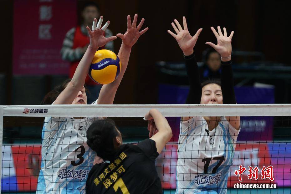 1月13日,在北京光彩体育馆举行的2025-2026中国女子排球超级联赛常规赛A级第九轮比赛中,北京北冰洋3:1胜河南双汇。图为北京女排拦网。中新社记者 王紫儒 摄