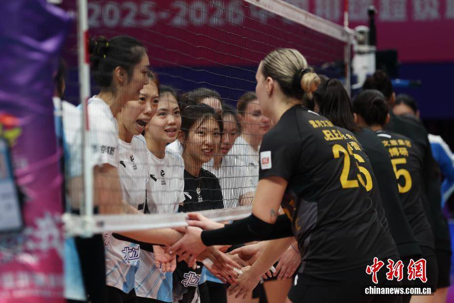 1月13日,在北京光彩体育馆举行的2025-2026中国女子排球超级联赛常规赛A级第九轮比赛中,北京北冰洋3:1胜河南双汇。图为比赛结束后双方球员握手。中新社记者 王紫儒 摄