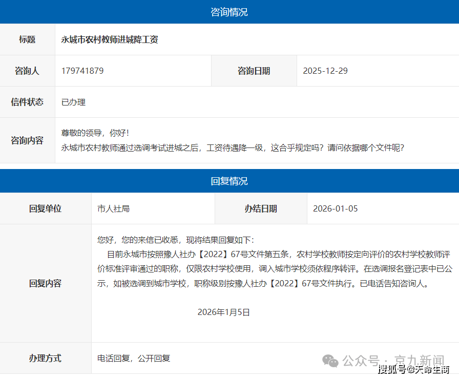目前永城市按照豫人社办【2022】67号文件第五条,农村学校教师按定向评价的农村学校教师评价标准评审通过的职称,仅限农村学校使用,调入城市学校须依程序转评。在选调报名登记表中已公示,如被选调到城市学校,职称级别按豫人社办【2022】67号文件执行。已电话告知咨询人。