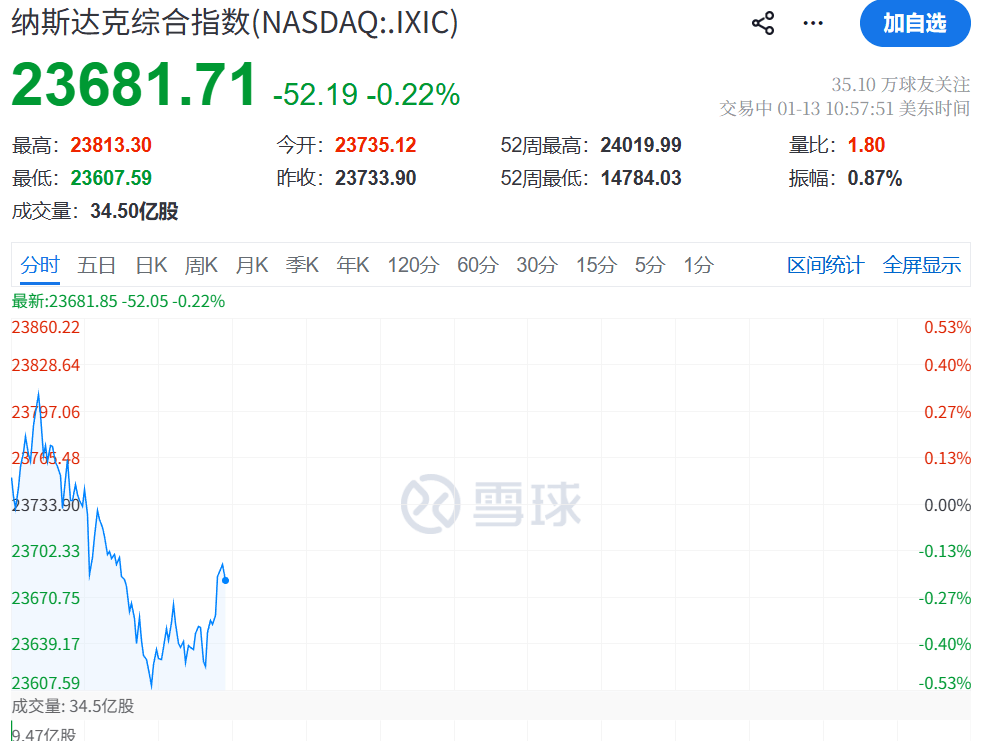 1月13日晚间,美股三大指数开盘之后,逐渐下跌。道指一度跌超300点,纳指跌约0.5%,市场避险情绪浓厚。