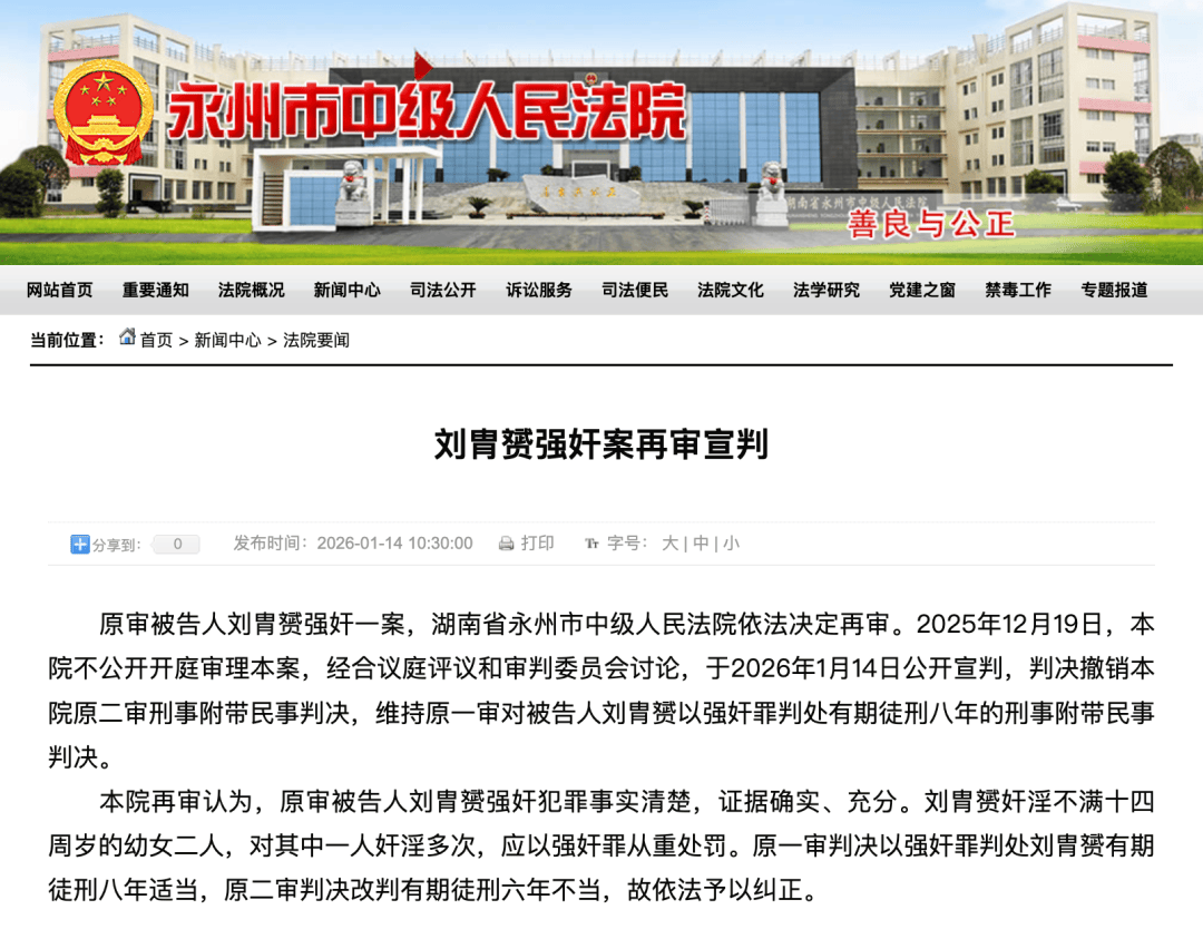 据永州市中级人民法院今天(14日)消息,原审被告人刘胄赟强奸一案,湖南省永州市中级人民法院依法决定再审。