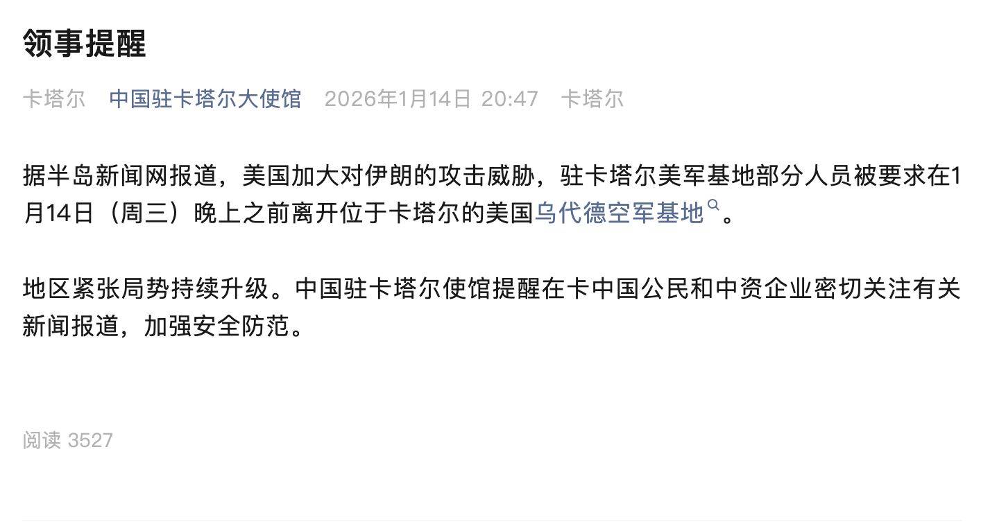 当地时间14日,中国驻卡塔尔大使馆发布领事提醒,称地区紧张局势持续升级,使馆提醒在卡中国公民和中资企业密切关注有关新闻报道,加强安全防范。