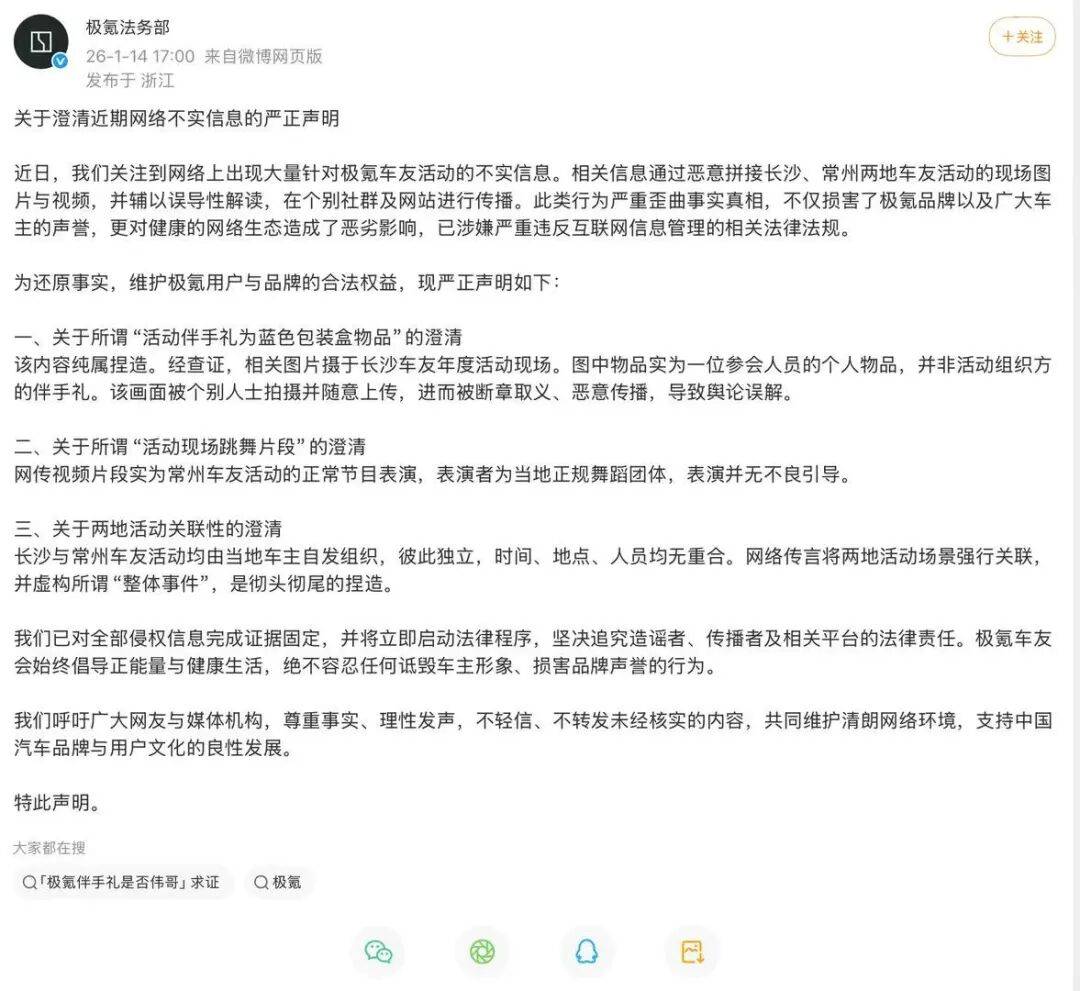 1月14日下午,极氪法务部在官方微博账号发文称,近日关注到网络上出现大量针对极氪车友活动的不实信息。相关信息通过恶意拼接长沙、常州两地车友活动的现场图片与视频,并辅以误导性解读,在个别社群及非法网站进行传播。此类行为严重歪曲事实真相,不仅损害了极氪品牌以及广大车主的声誉,更对健康的网络生态造成了恶劣影响,已涉嫌严重违反互联网信息管理的相关法律法规。