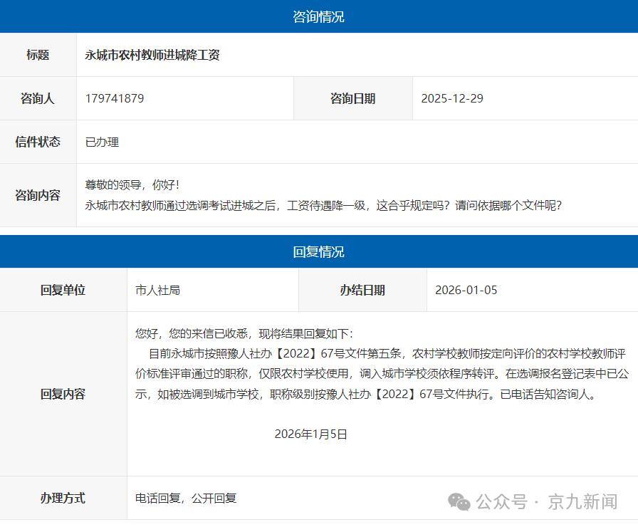 永城市农村教师通过选调考试进城之后,工资待遇降一级,这合乎规定吗?请问依据是哪个文件?