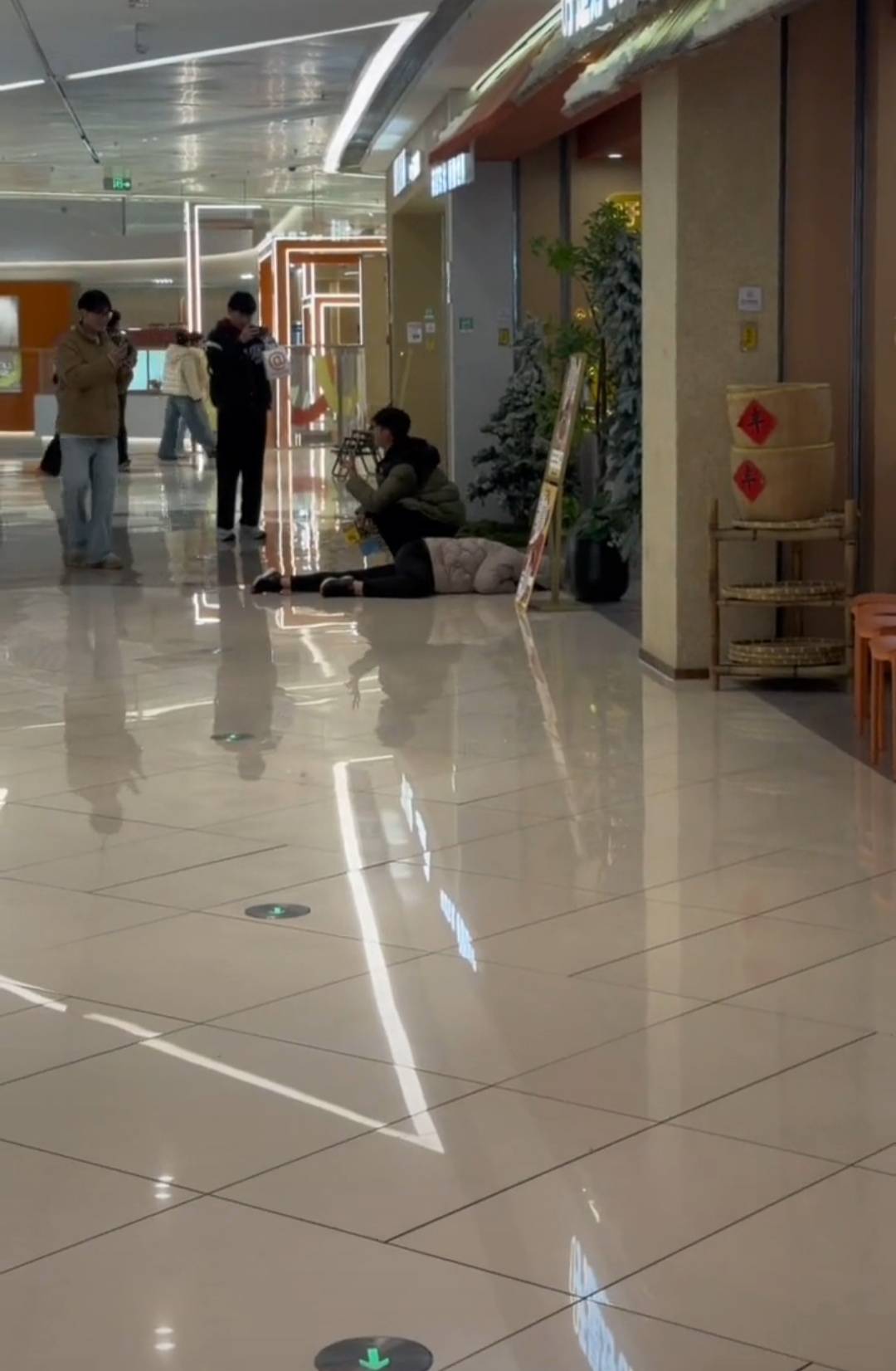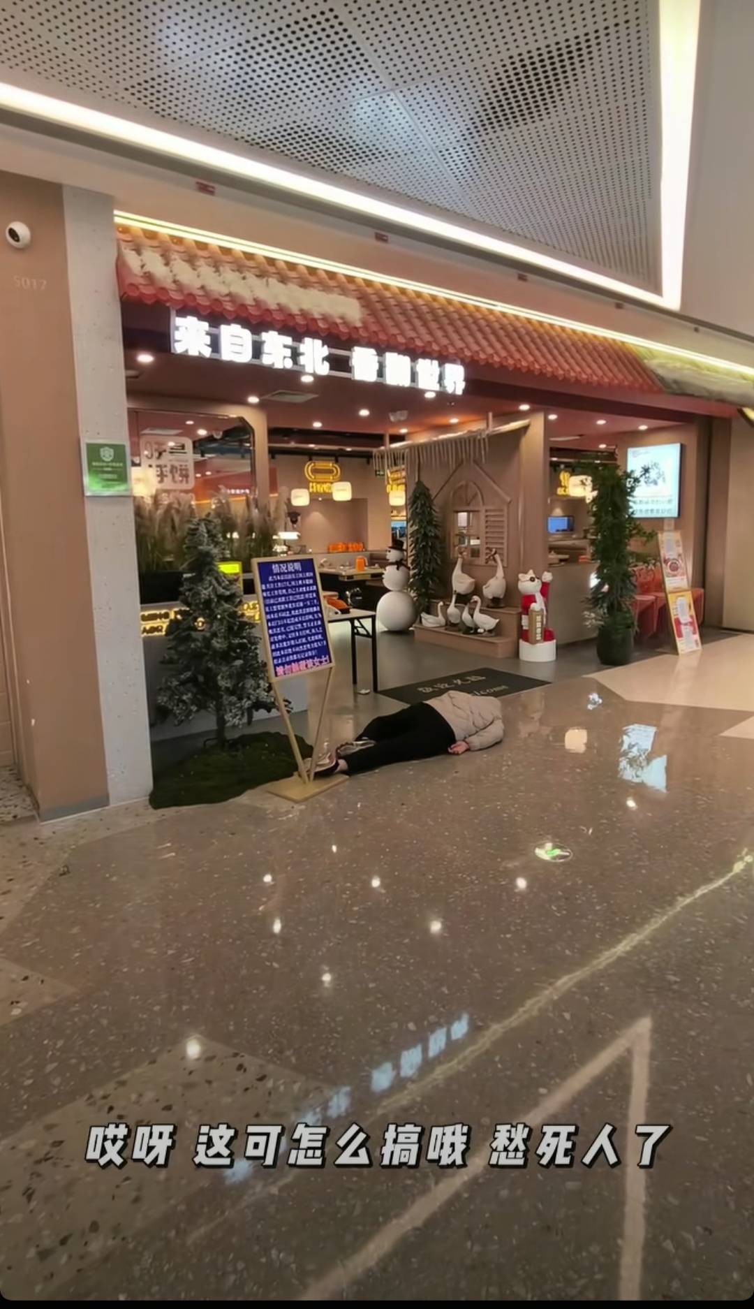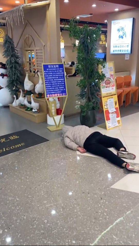 1月14日,河南夏邑,网友发视频反映,一女子躺在一商场的饭店门口,还有人在旁边合影拍照,称是当地新的“打卡点”。