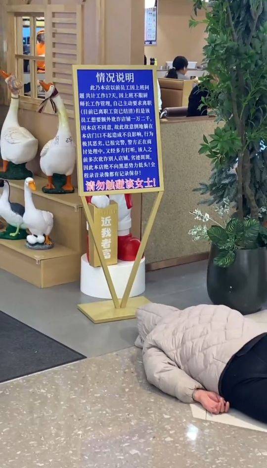 视频显示,女子旁放了一块告示牌:该女子是饭店前员工,工作17天后离职,工资已结清。但她想要额外的钱被拒后,故意躺在这里,“请勿触碰该女子。”