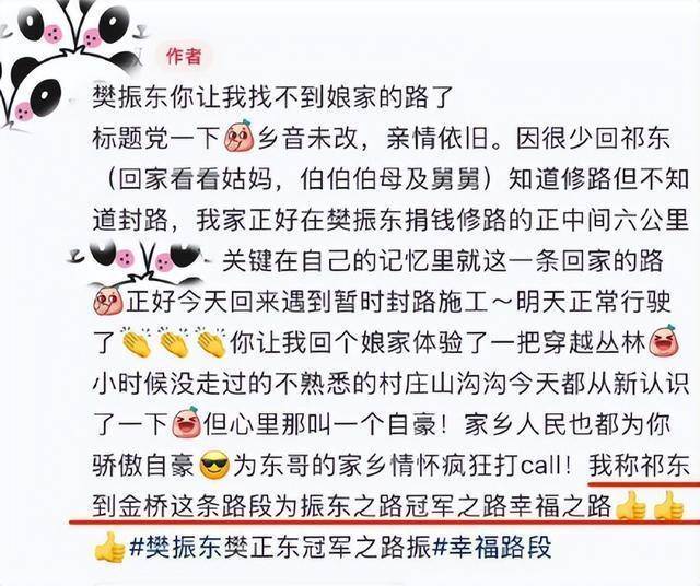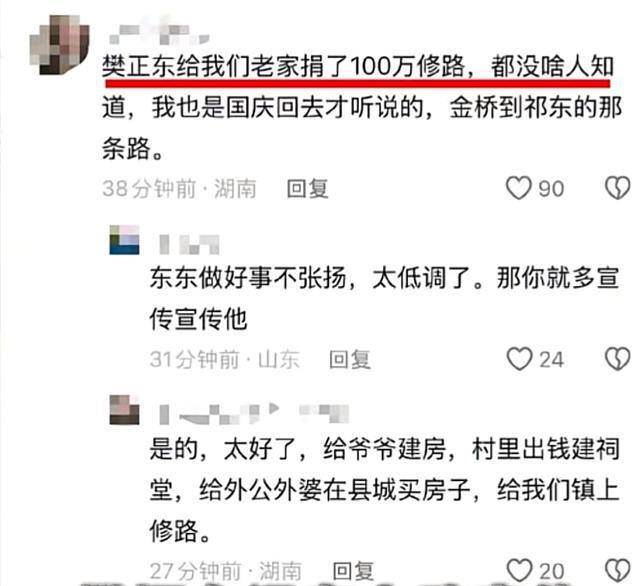 奥运冠军樊振东向家乡湖南祁东县金桥镇捐资100万元用于修缮主干道,承担了修路工程近六成的预算。