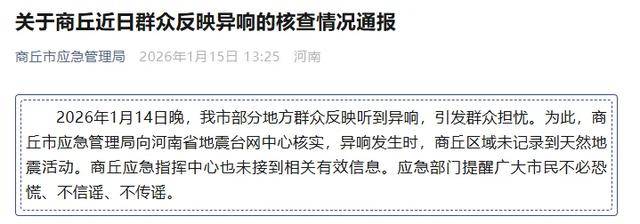1月15日,商丘市应急管理局通报称,该局向河南省地震台网中心核实,异响发生时,商丘区域未记录到天然地震活动。商丘应急指挥中心也未接到相关有效信息。应急部门提醒广大市民不必恐慌、不信谣、不传谣。
