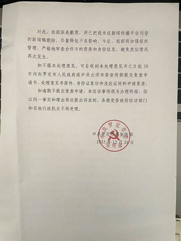 罗定市委宣传部方面深表歉意,并已把该市在新闻传播平台刊登的新闻稿删除,尽量降低不良影响。今后,该部将加强组织管理,严格地审查合作方的资质和身份信息,避免类似情况再次发生。