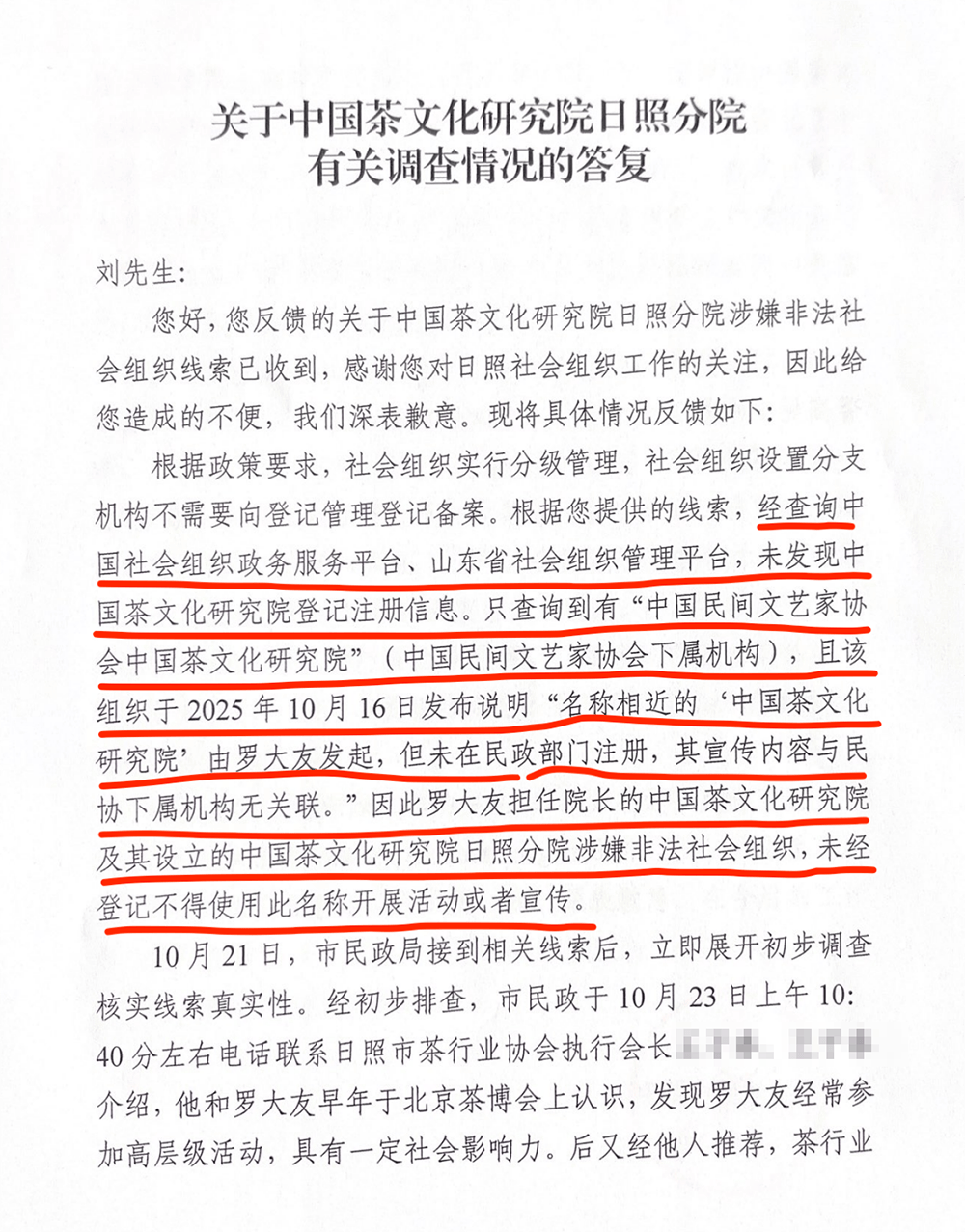 日照市民政局出具的《关于中国茶文化研究院日照分院有关调查情况的答复》受访者 供图