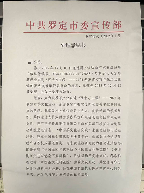此外,罗大友还参加了“大力发展茶产业奋进‘百千万工程’—2024年罗定市茶文化活动”。李健向广东省信访局反映核实罗大友身份一事。2025年12月26日,他接到来自罗定市委宣传部的《处理意见书》:经查,大力发展茶产业奋进“百千万工程”—2024年罗定市茶文化活动,是由罗定市委宣传部及相关单位共同主办的活动。市委宣传部及相关单位作为主办方,邀请人员方面由承办单位广东省长胜集团有限公司负责。