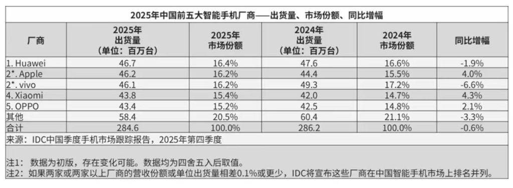 2025年全年,中国智能手机市场出货量约2.85亿台,同比下降0.6%。其中,华为位列第一,市场份额为16.4%;苹果第二,市场份额为16.2%,vivo第三,市场份额为16.2%;小米第四,市场份额为15.4%,OPPO第五,市场份额为15.2%。