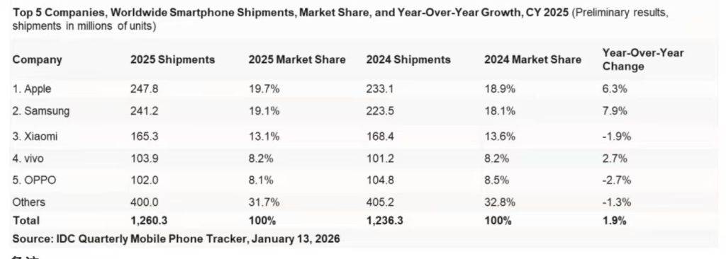 IDC的数据显示:2025全年,全球智能手机出货量达到12.6亿部。2025年全球前五位手机厂商分别为苹果、三星、小米、vivo和OPPO。其中,苹果、三星、vivo三家全年保持增长,小米和OPPO两家略有下滑。