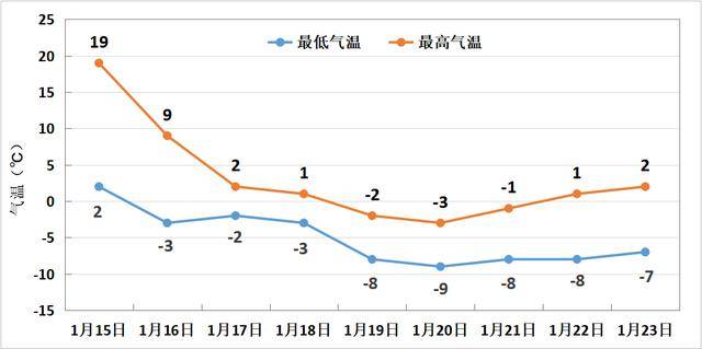气温方面,19日有3-4级东北风,阵风6级左右。17日起气温较前期大幅下降,气温降幅大,低温持续时间长。19日至20日最高气温降至零下3℃~零下2℃,19日至23日最低气温维持在零下9℃~零下7℃。
