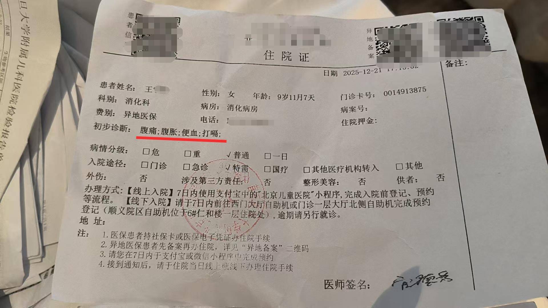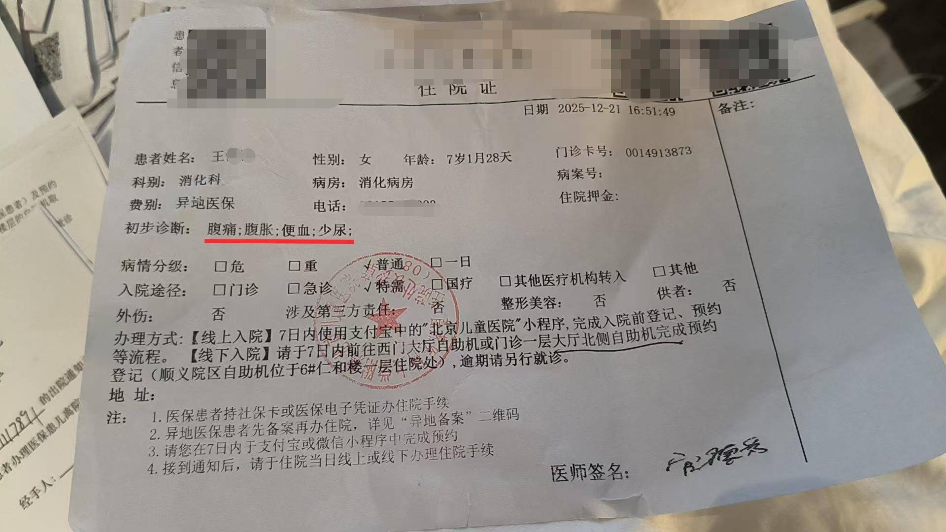 2025年8月,方女士的两个女儿均出现了腹胀、便血、血尿的情况,她便带着两个女儿到上海的医院检查,“肾脏和感染科医生联合诊断后推测,可能与腹腔感染相关,但病因仍不明确。小女儿现在还在血尿,尿常规指标时好时坏,红细胞一直在几十个以内,有时候一天只能尿一次,医生曾怀疑过尿毒症,检查后也排除了这一可能。”方女士说。