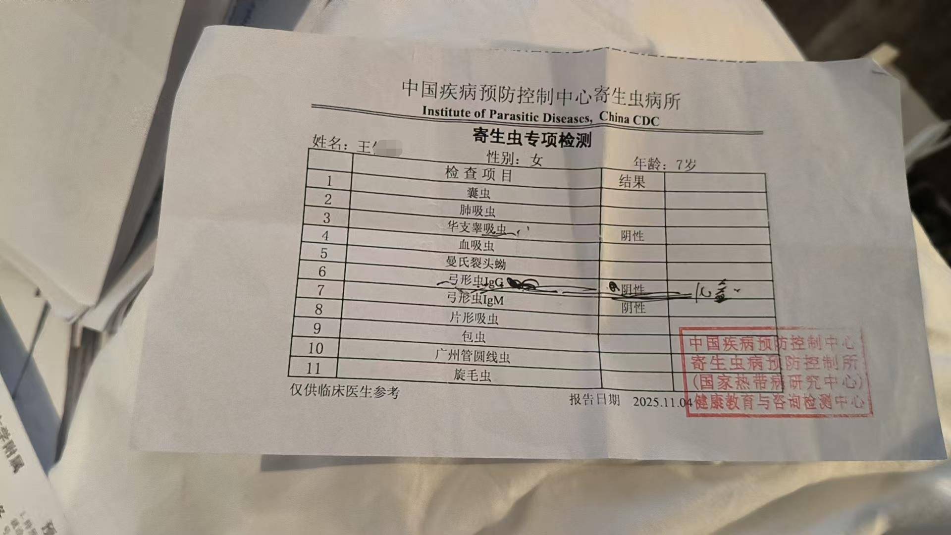 方女士小女儿的寄生虫检测结果(受访者供图)