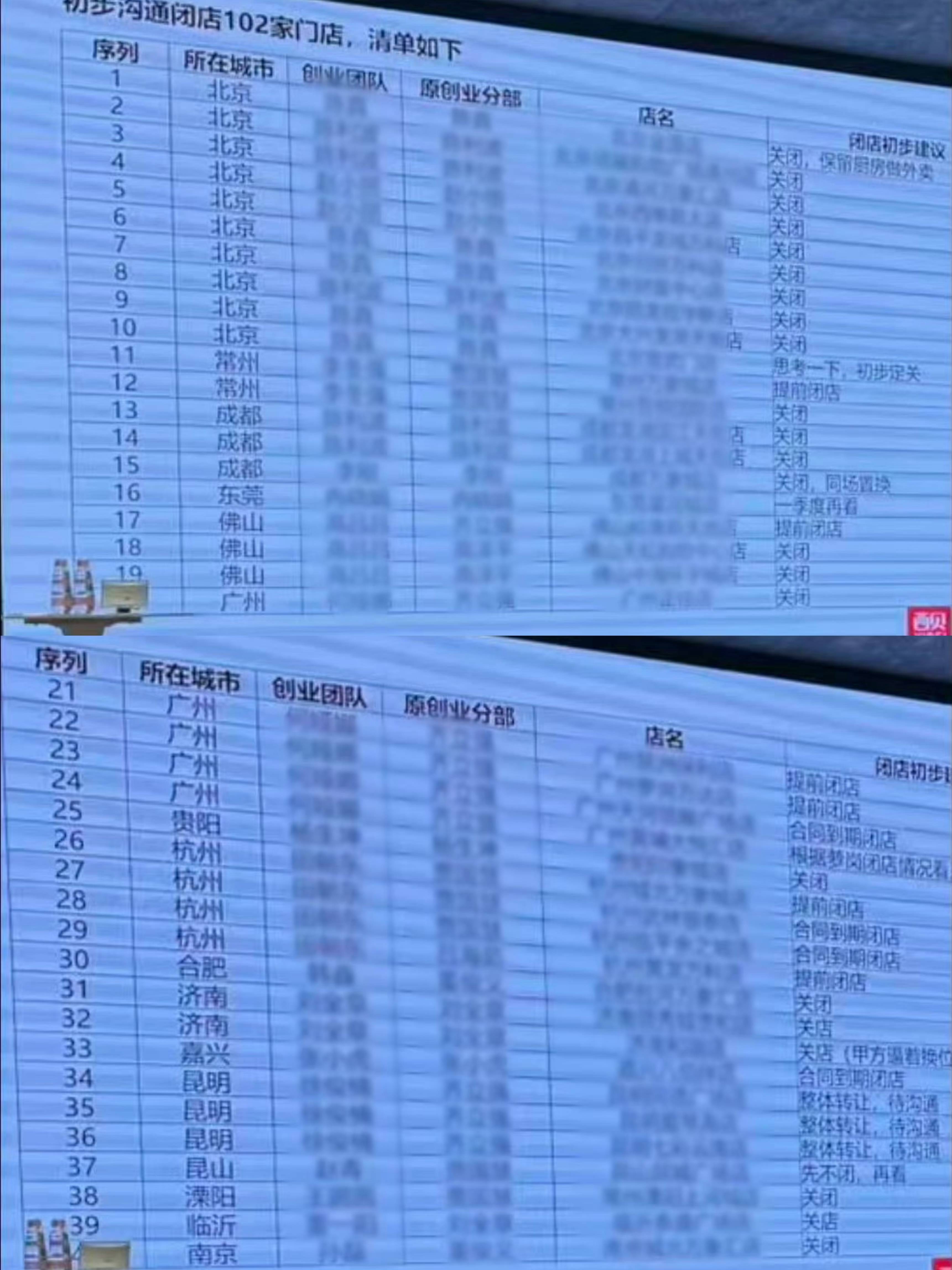 从城市分布来看,此次被列入清单的门店并未集中于低线市场,而是更多分布在一线及新一线城市。这类城市往往租金、人力成本较高,也是品牌早期和快速扩张阶段重点布局的区域。