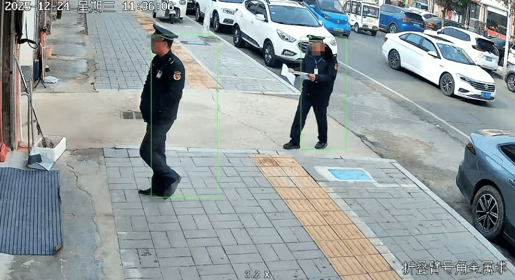 门店监控视频显示,2025年12月23日12时13分,两名身穿城管制服的男子上门检查。因门店喇叭声,听不清城管和朱俊峰的交流内容。