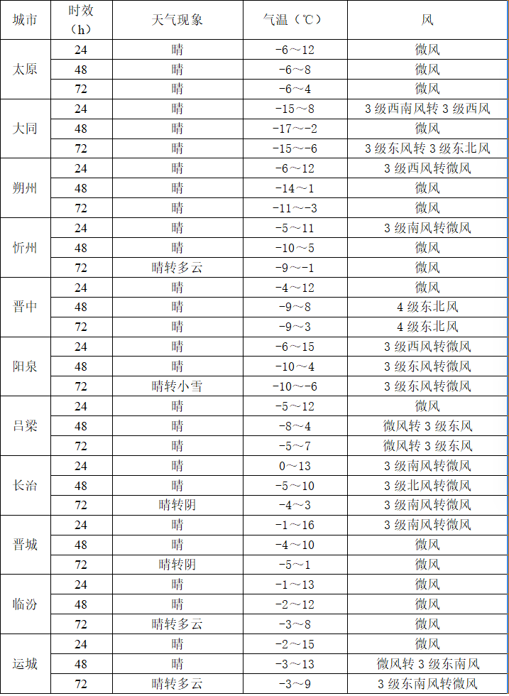 1月15日:全省都是晴天间多云,但北部部分地区和中南部局部会刮4-5级偏西风,短时还能冲到6-7级,最高温:北部和中南部山区7-11℃,中南部其余地区能冲到11-17℃;最低温:高寒地区低至-15℃左右,北部和中南部山区-12~-5℃,中南部其余地区-5~2℃。