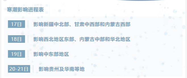 17日至21日,受寒潮影响,我国大部地区气温将普遍下降6~10℃,其中新疆沿天山地区、内蒙古中西部、黄淮东部、西南地区东部、江淮、江南北部和西部等地降温幅度可达12℃以上;并伴有4~6级偏北风,阵风7~9级。21日早晨,最低气温0℃线将南压至贵州到江南南部一带。另外,受补充冷空气影响,23日前南方地区将维持低温天气。