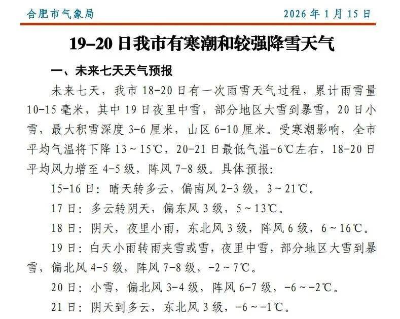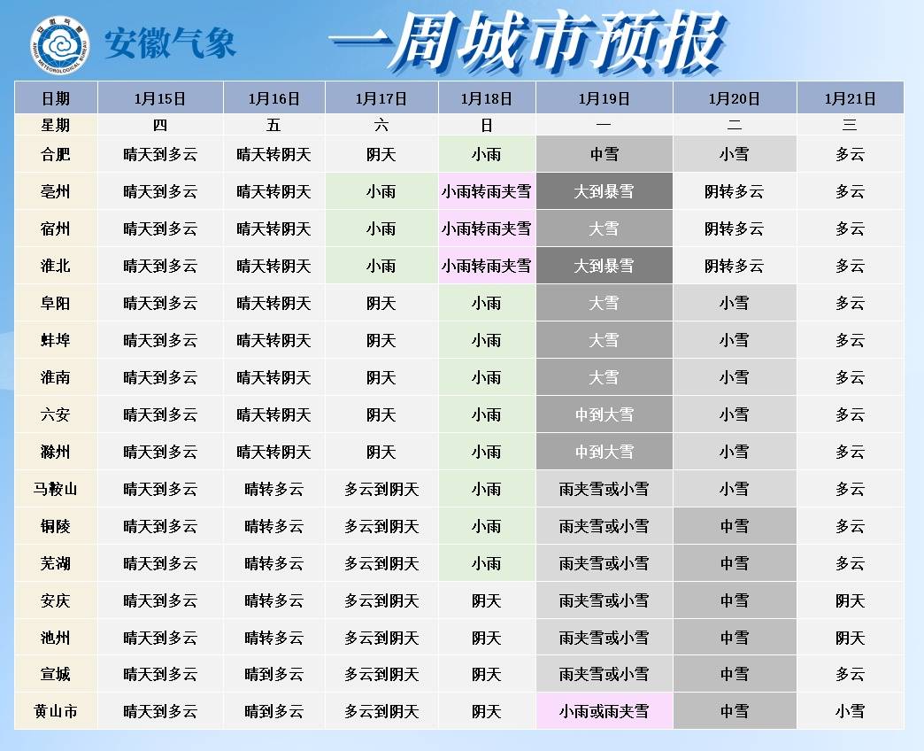 据安徽省气象台预测:15日至16日全省以晴到多云天气为主。17日至20日我省有一次雨雪天气过程,其中19日沿淮淮北部分地区有大雪,局部暴雪。