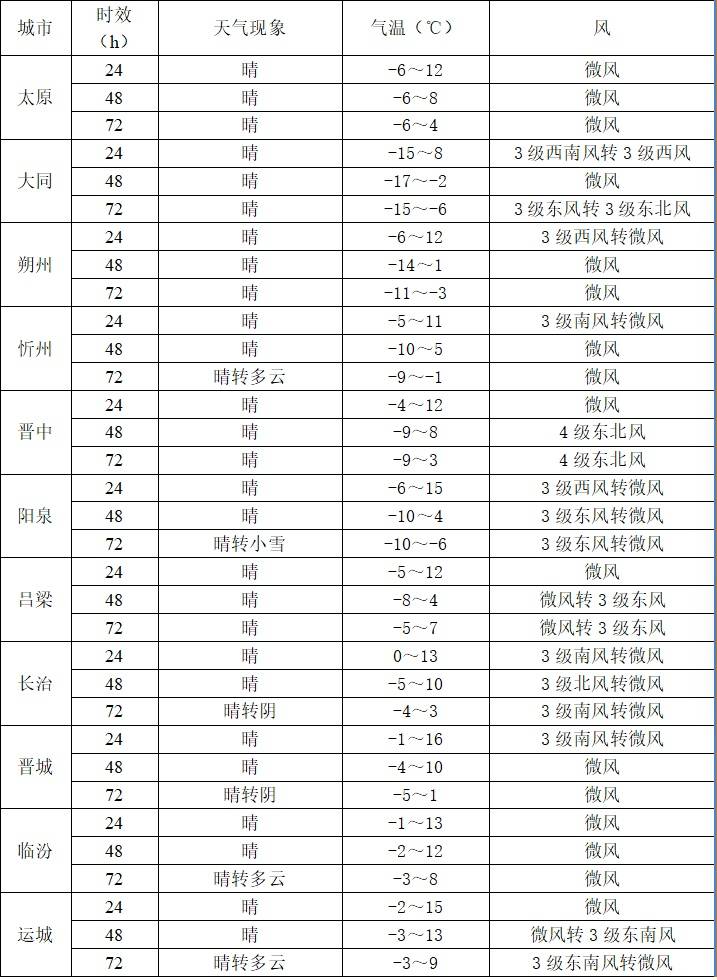 1月15日:全省都是晴天间多云,但北部部分地区和中南部局部会刮4-5级偏西风,短时还能冲到6-7级,最高温:北部和中南部山区7-11℃,中南部其余地区能冲到11-17℃;最低温:高寒地区低至-15℃左右,北部和中南部山区-12~-5℃,中南部其余地区-5~2℃。