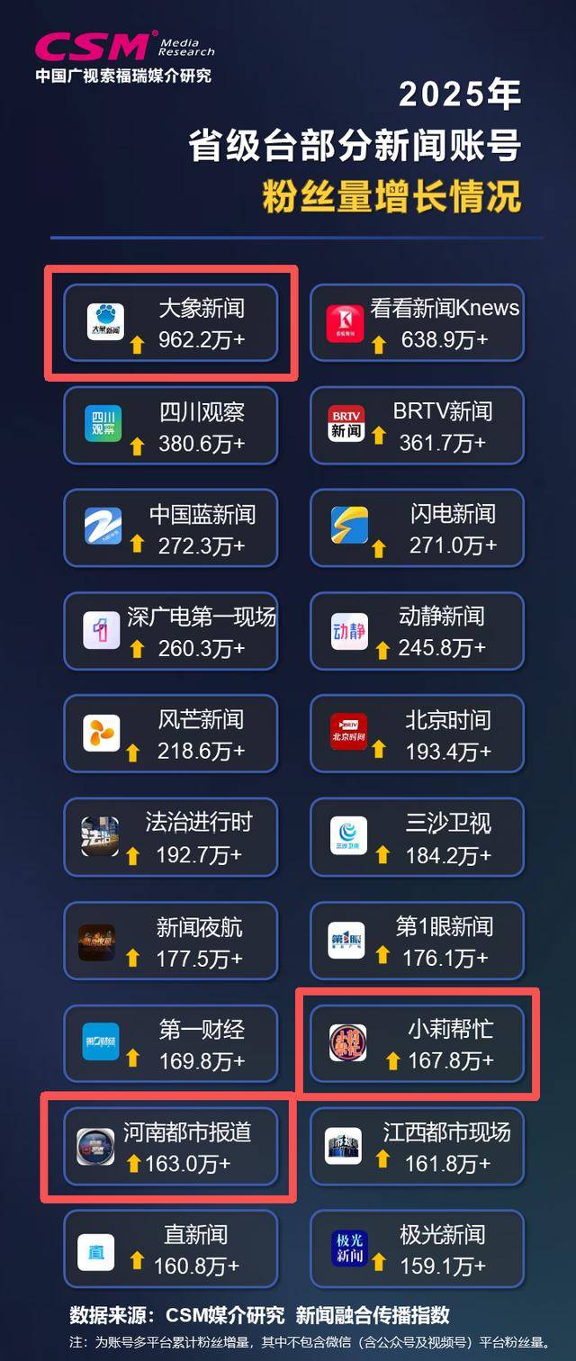 2025年,在抖音、快手、腾讯新闻、今日头条、微博、微信(含视频号、公众号)、好看视频、网易新闻等8个平台上,CSM共观察到省级台旗下活跃新闻账号超2500多个,同名合并账号855个。