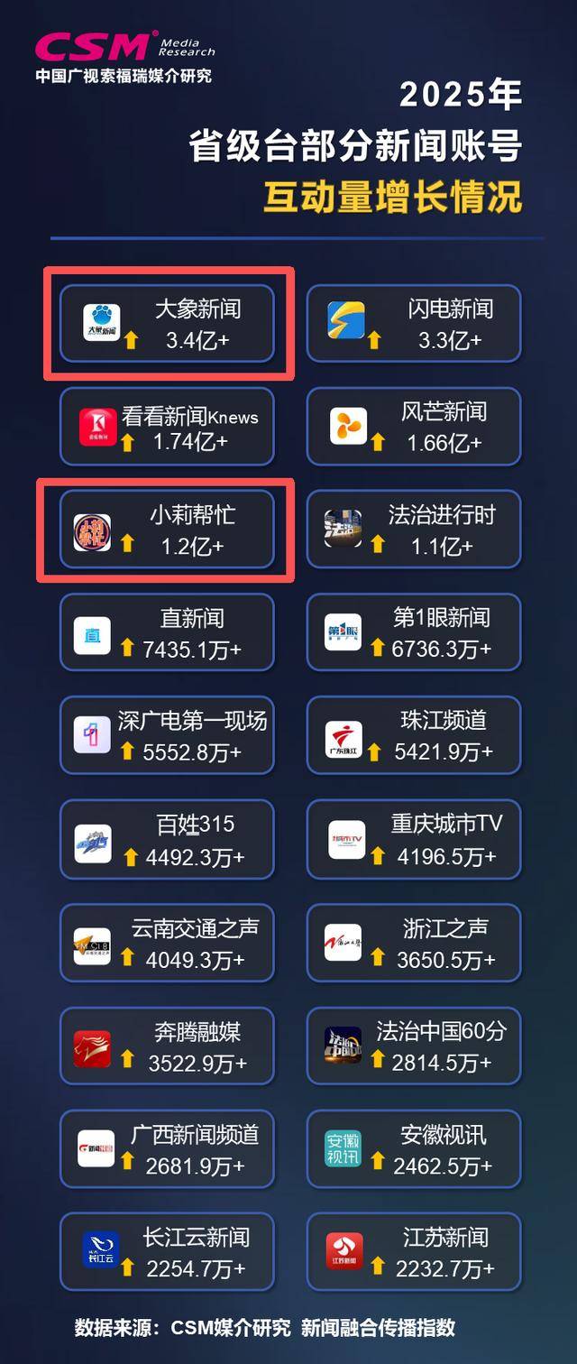 @大象新闻提升新闻品质,丰富品牌内涵,持续关注社会民生,同时加强硬核新闻和深度内容。全年揽获超778.4亿传播量,稳居省级台账号领先位置;分发量同比增长106.3%;下半年,账号互动率环比提升33.5%,用户黏性增长。跟进民生热点,发布“李福贵”回应走红、张伟“跪母救人”等,传播量均居省级台同题内容首位;强化时政新闻报道,如开设《象·北京》及时传递国家部委新闻发布会信息和独家解读;加大调查报道力度,推出的暗访长沙非法代孕揽获超10亿传播量,揭露骗贷产业链、外汇“杀猪盘”等均揽超千万流量;强化新闻评论,评论类短视频互动量领先。此外,网络直播累计观看人次超12.5亿,267场观看量超百万,居省级台新闻账号领先位置。CSM 2025年度网民调查显示,用户综合评价居前列,在“反映大众心声”“接地气,有温度”“反应迅速,及时跟进热点/突发事件”等方面,赢得用户认同。