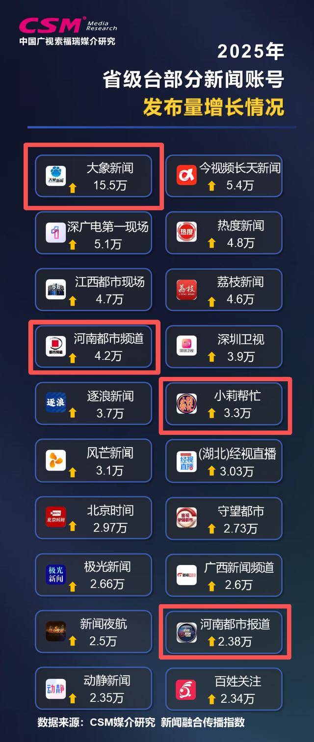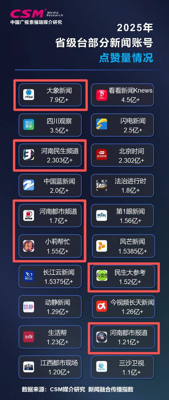 CSM新闻融合传播年度指数发布:2025年,河南台新闻融合传播年度指数在省级台中持续领先;在各项分指数中,网络、短视频、微博、自有客户端等传播指数均保持领先优势,微信传播指数首次进至年度领先位。在中国新闻奖等相关奖项评选中,河南台获奖数量居省级台领先位置。此前,河南台已持续三年领跑多个榜单。