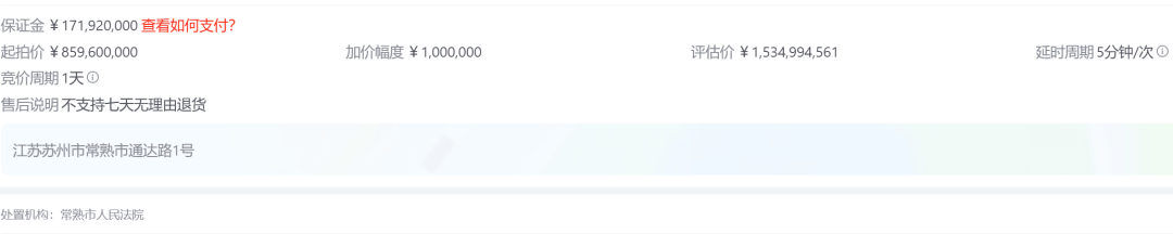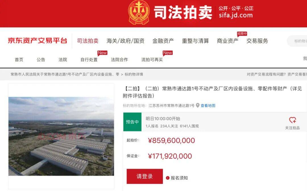 在京东资产交易平台上,名为“(二拍)常熟市通达路1号不动产及厂区内设备设施、零配件等财产(详见附件评估报告)”的标的物显示“明日(即1月15日)”开拍,此次拍卖包含厂区内部分设施设备(包含公用动力设备、工艺设备、辅助生产设备、行政办公设备等)及零配件。估值为约15.35亿元,起拍价为8.6亿元,截至目前有近8000人围观,仅1人报名。
