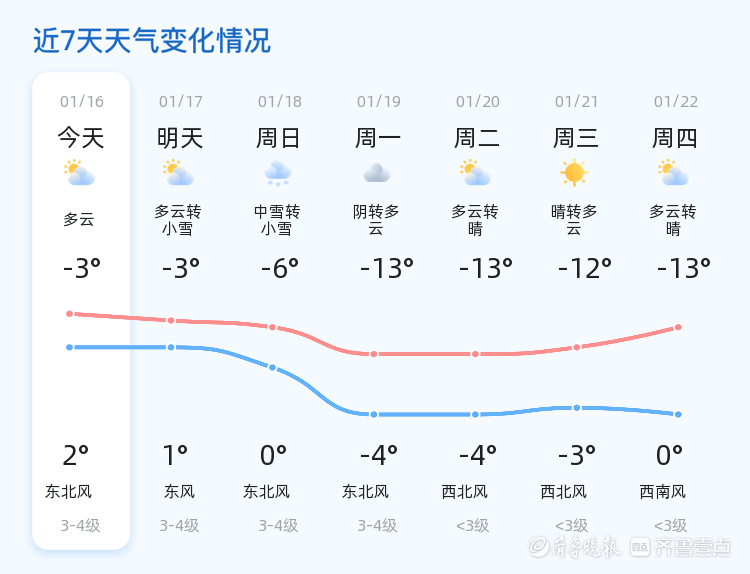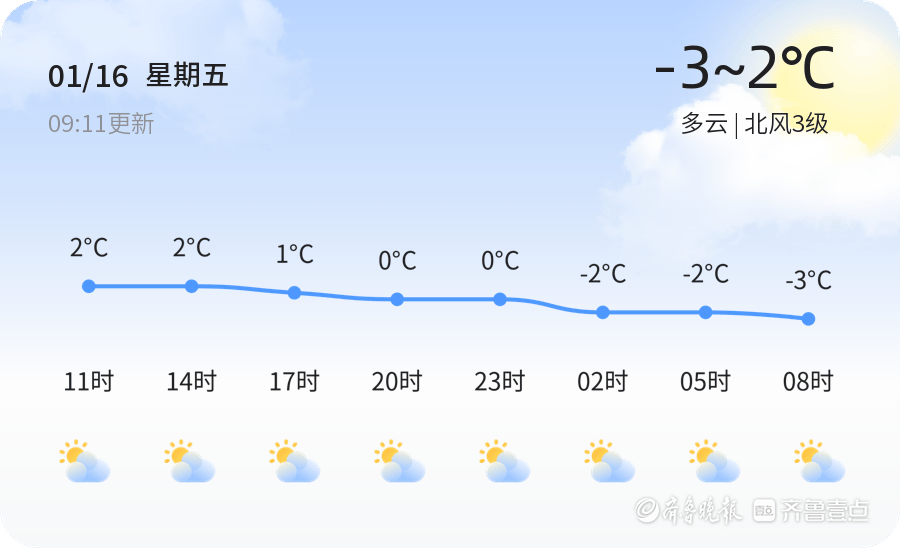 今天是1月16日,农历十一月廿八,星期五。滨州今天以多云天气为主,气温在-3℃到2℃之间,北风3级,空气湿度90%,PM2.5指数为114。各区天气情况总体平稳,但市民仍需注意保暖。