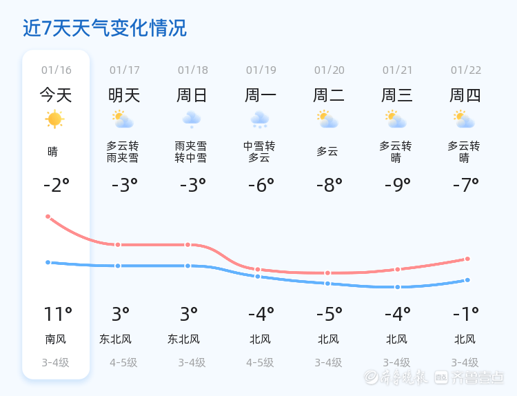 今天是2026年1月16日,农历十一月廿八,星期五。青岛市今天天气晴朗,气温在-2℃至11℃之间,东南风2级,空气湿度为90%,PM2.5指数为109。各区天气情况基本一致,均为晴朗天气,温度温和,适合市民户外活动。明天青岛市天气将有明显变化,预计为多云转雨夹雪,气温在-3℃至3℃之间,东北风4-5级。与今天相比,明天的气温有所下降,且有降水过程,市民出行需携带雨具并注意防滑。未来三天,青岛市天气将以雨夹雪和中雪为主,气温在-3℃至3℃之间波动。其中,18日将出现雨夹雪转中雪天气,19日中雪转多云,20日至22日天气以多云为主,温度逐步回升。市民需注意保暖,尤其是早晨和夜间,温度较低,建议增添衣物。温馨提示