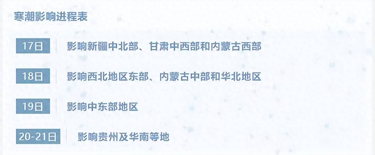 17日至21日,受寒潮影响,我国大部地区气温将普遍下降6~10℃,其中新疆沿天山地区、内蒙古中西部、黄淮东部、西南地区东部、江淮、江南北部和西部等地降温幅度可达12℃以上;并伴有4~6级偏北风,阵风7~9级。