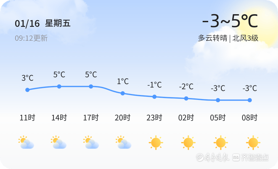 今天是1月16日,星期五,农历十一月廿八。聊城市的天气为多云转晴,温度在-3℃到5℃之间,北风3级,空气湿度87%,PM2.5指数为138,空气质量为中度污染。建议市民外出时佩戴口罩,做好防寒保暖措施,注意行车安全。