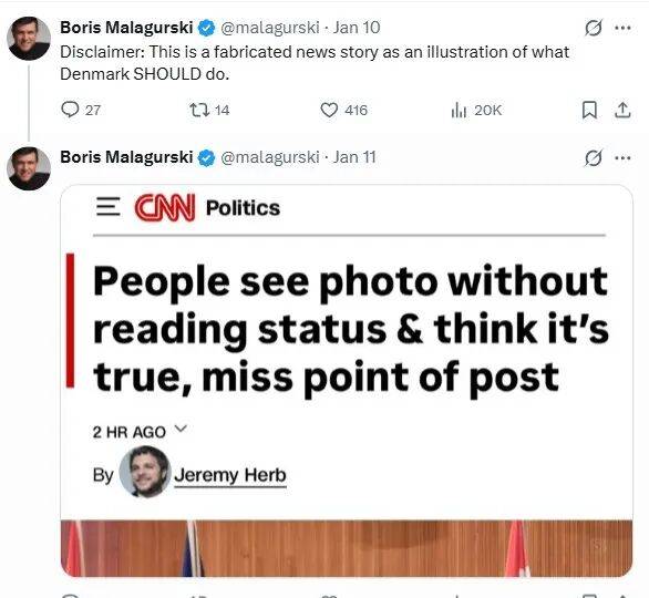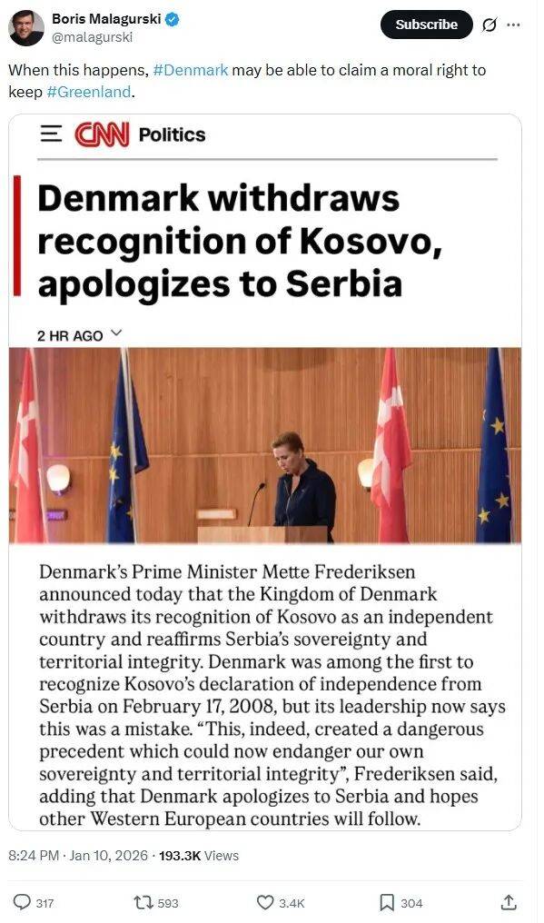 通过对网传CNN截图反搜溯源,可以找到,最初发布者是塞尔维亚裔加拿大籍电影导演Boris Malagurski,1月10日,他在X平台发布了这张图片,配文为:“当这种情况发生时,丹麦或许可以声称拥有保留格陵兰岛的道德权利。”