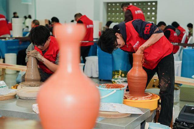 竞赛场馆内,参赛选手斗志昂扬,纷纷掏出自己的“看家本领”。来自江西景德镇的梁启鹏介绍,他今年17岁,就读于景德镇陶瓷技师学院,是第一次参加国家级陶瓷竞赛,这次的参赛项目是陶瓷拉坯。