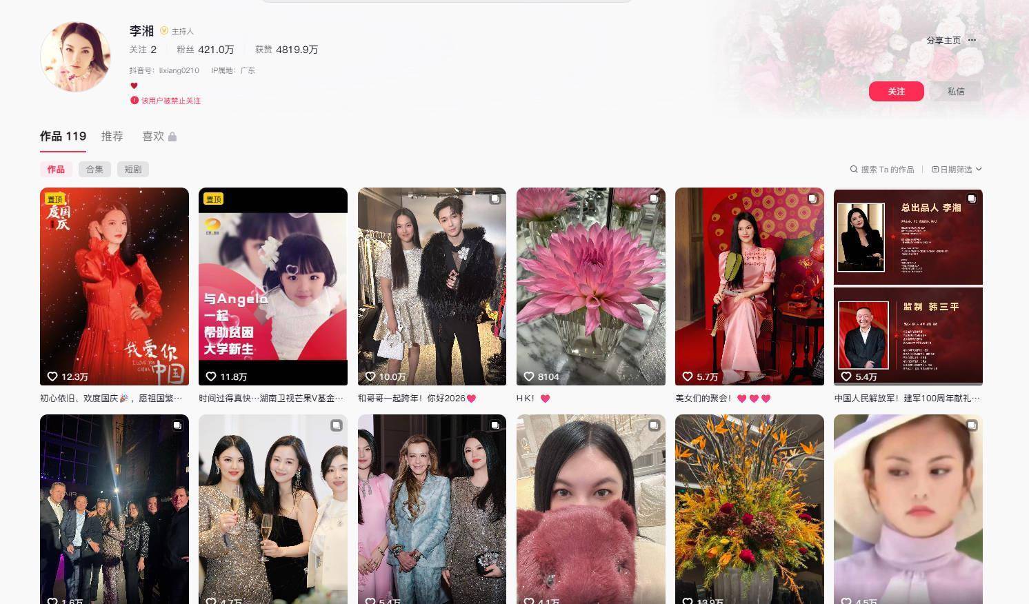 1月16日,极目新闻记者注意到,前湖南卫视主持人李湘的抖音、小红书和微博的账号被禁止关注。