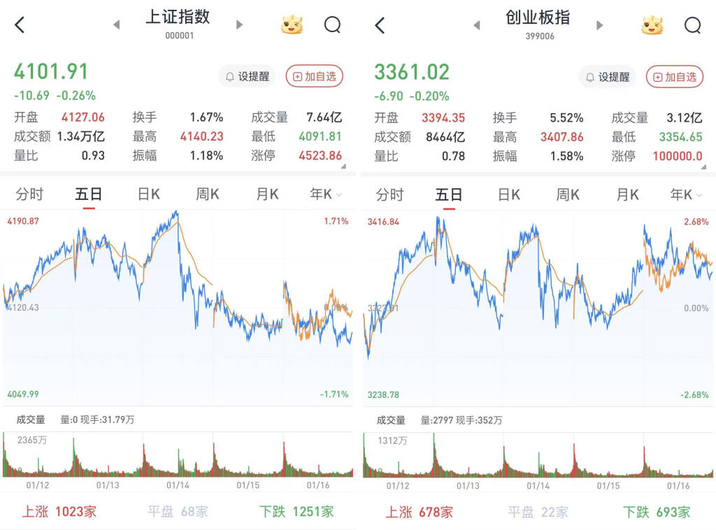 A股三大股指1月16日集体高开。早盘高开低走,AI应用题材全线回落。午后两市维持低位震荡走势,沪指险守4100点关口。