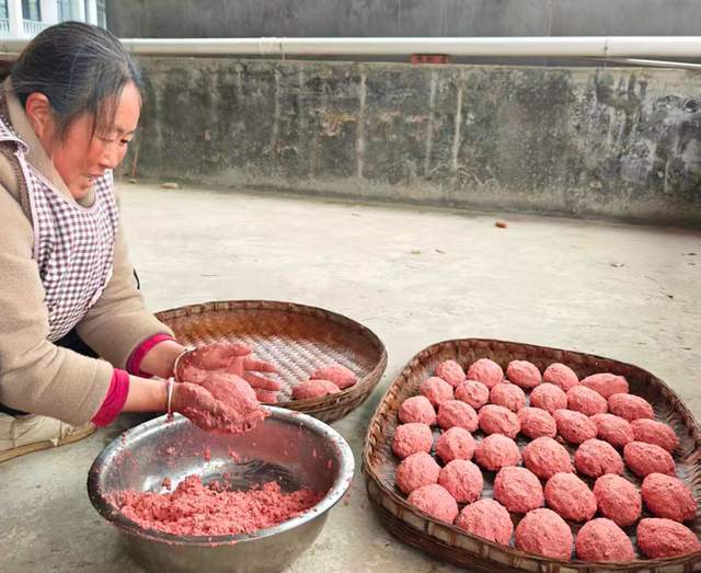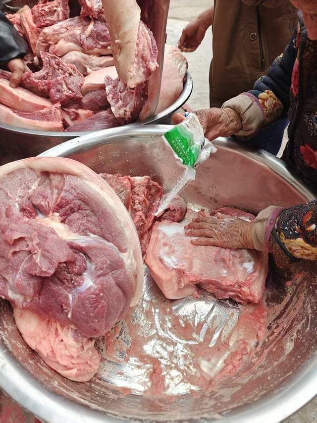 院坝角落的另一处,李大哥拿起一块肥瘦相间的五花肉放入大盆中,加入盐反复揉搓,确保每一块肉都均匀裹上调料。揉搓好的猪肉要放进盆里密封腌制,李大哥说:“现在温度低,腌个三四天就行,每天还要翻拌一次,让味道更均匀。腌好后挂在屋檐下通风,等到表皮干爽、肉质紧实,腊肉就成了。”