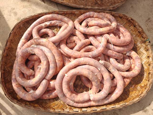 与腌制腊肉同步进行的,还有灌制香肠的活儿。一旁,几位大哥正熟练地调配香肠馅料,将肥瘦比例适中的猪肉切成小块,加入盐、辣椒、葱、姜、花椒面等调料,充分搅拌均匀。馅料备好后,就该往肠衣里灌了。有人手持提前泡软的猪肠衣,将其一端套在特制的灌香肠工具上,另一端用棉线扎紧;有人负责往工具里添馅料,还有人双手轻轻握住肠衣,随着馅料的注入慢慢向前推送,同时用手轻轻拍打肠衣,排出里面的空气,避免煮的时候破裂。灌好一段后,就用棉线每隔一段扎一个结,分成均匀的小段,再用针在肠衣上扎几个小孔,进一步排出残留的空气。“灌香肠关键要松紧适度,太松煮出来会散,太紧口感不好。”正在忙碌的王大姐说着,还不忘给记者展示刚灌好的香肠,粉嘟嘟的香肠盘在簸箕上,透着新鲜的肉香,格外诱人。还有用豆腐和新鲜猪血、猪油混合搅拌制作成的会东特色美食血豆腐。