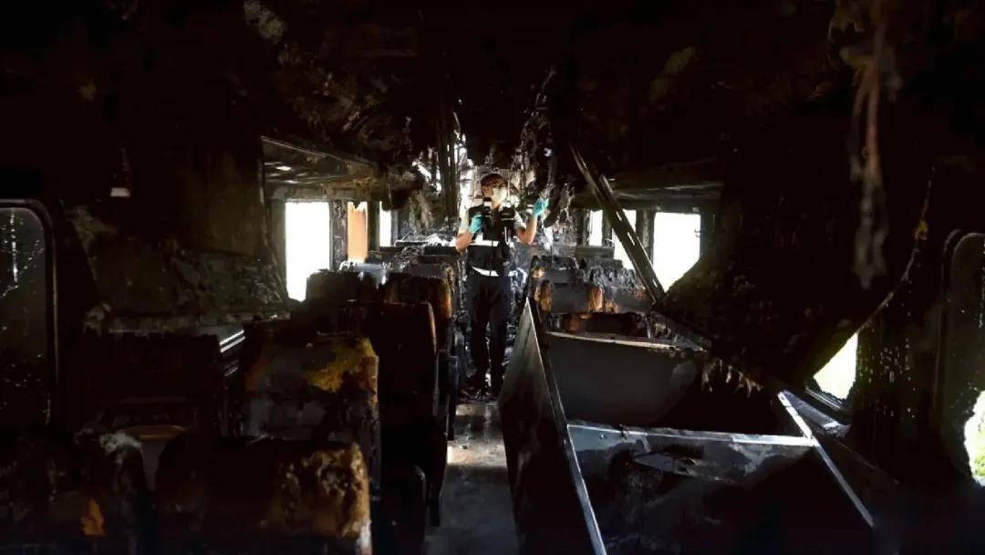 列车以高速迎面撞上倒塌的起重机,现场传出巨大撞击声。起重机部分钢结构在冲击下塌落至车厢顶部,多节车厢随即出轨并严重变形,车窗破裂、车体结构受损,其中部分车厢发生燃烧,乘客被困在扭曲的残骸之中。