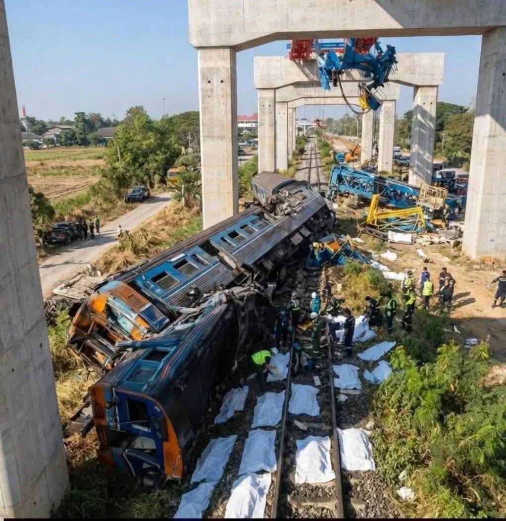 据泰国国家报及当地官方通报,事故发生于上午约9时05分,地点位于Si Khiu班塔农科特一带。当时,一列由曼谷开往乌汶府(Ubon Ratchathani)的长途客运列车正通过该路段。就在列车进入施工区域附近时,一台用于高铁高架桥梁建设的施工起重机意外倒塌,横亘在列车行进路线上。