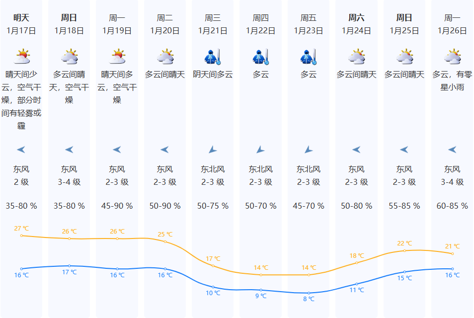 深圳新闻网2026年1月16日讯(记者 张小臣 魏梓晴)又到周五啦!周末(1月17-18日)天气不错,很适合出游。但注意,下周三(1月21日)起将有明显降温,暖意退场。大家抓紧好天气出门走走,也记得提前备好厚衣服哦!