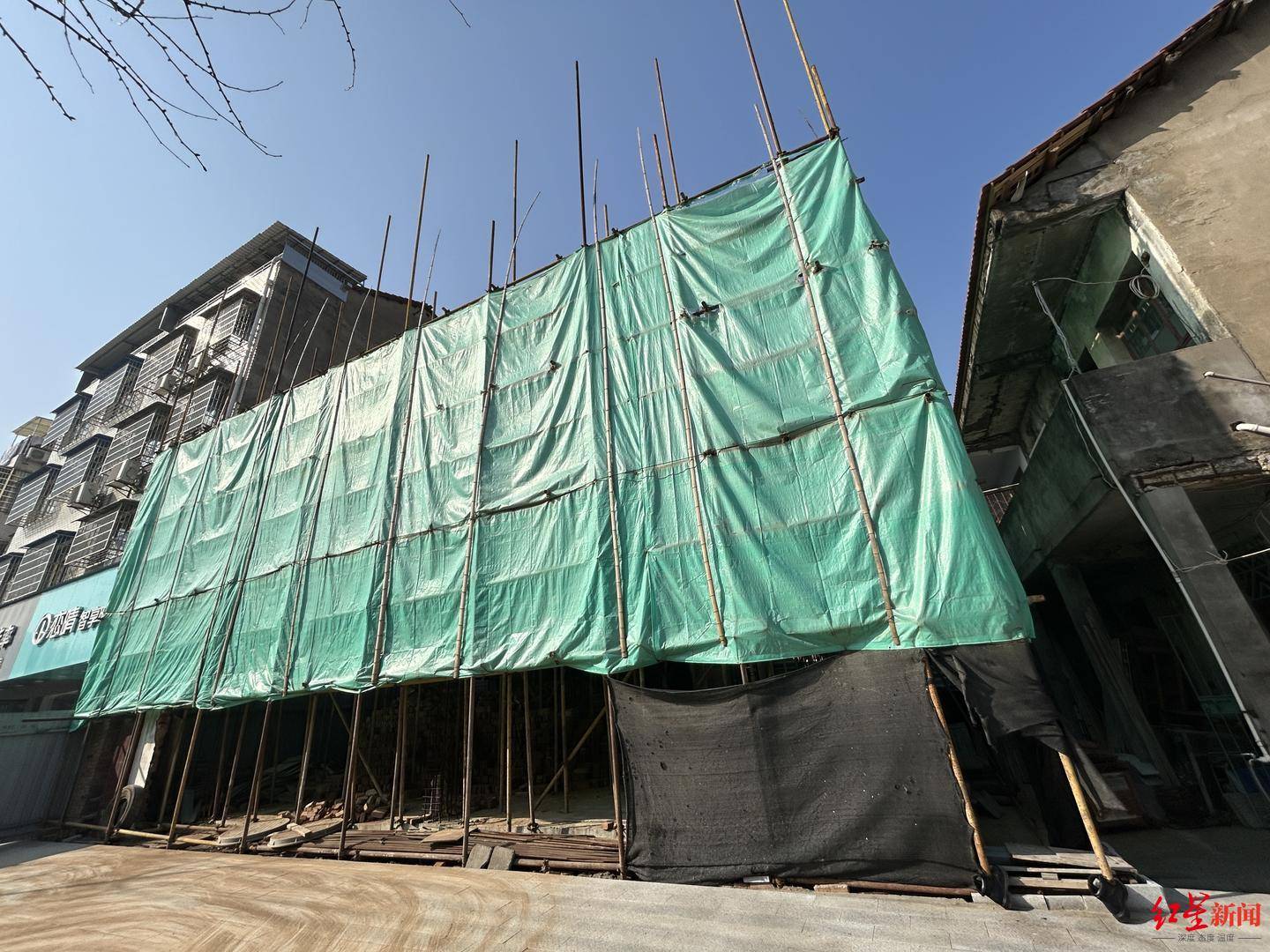 1月15日,红星新闻记者在现场看到,詹先生的建房处紧邻新洲区文昌大道,早已停工的工地被绿布和围挡围了起来。进入围挡内,房屋的地基已经成型,地基上堆放着大量砖块,锈迹斑驳的脚手架已经搭建至两层以上。