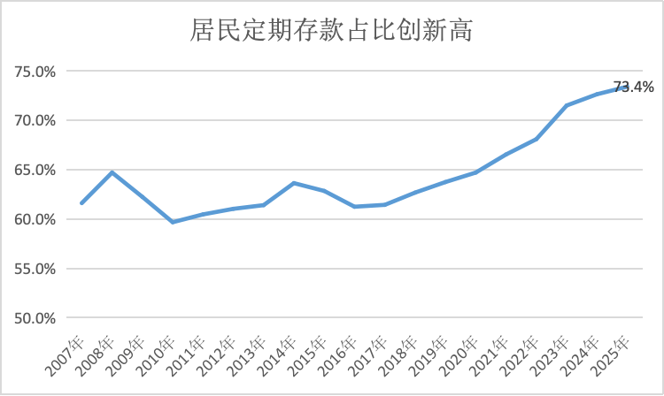 长期以来,我国居民部门定期存款余额占其存款总额的比例稳定在60%左右,形成“六四开”格局。然而自2020年起,这一比例持续攀升,去年更是创下73.4%的历史峰值,标志着“定活结构”已进入“七三开”时代。