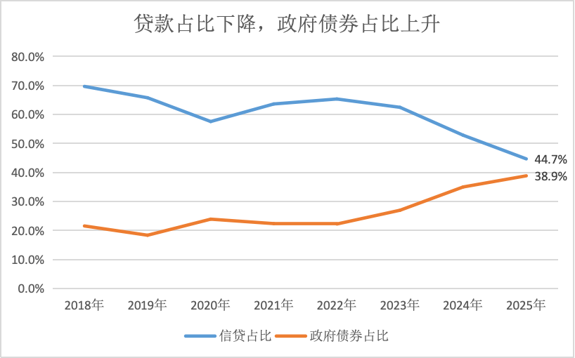 但2025年社融结构出现一个重大变化:信贷占比首次降至50%以下。央行数据显示,2025年全年社会融资规模增量累计为35.6万亿元,其中对实体经济发放的人民币贷款增加15.91万亿元,信贷占社融增量的44.7%。