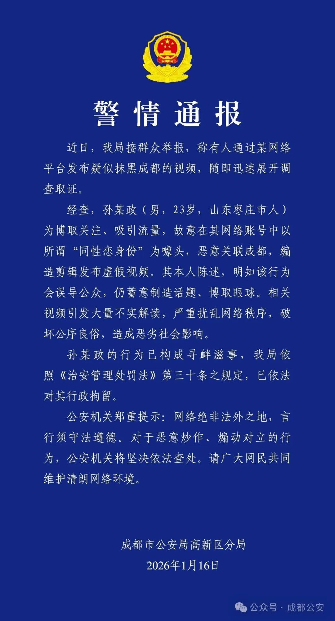 成都公安通报:一男子为博流量损害城市形象,已被行政拘留