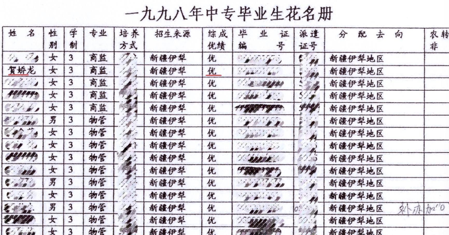 16日清晨,甘肃兰州城市学院校友会发文追忆优秀校友贺娇龙。极目新闻记者注意到,贺娇龙在该校上中专时的招生卡、学籍卡和毕业成绩单首次被公开。毕业生花名册显示,她的毕业综合成绩为“优”。
