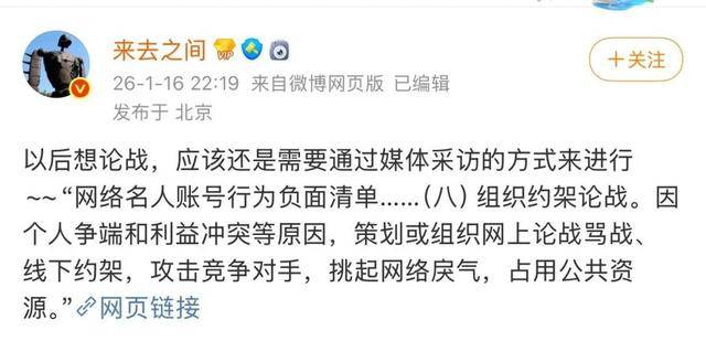 据北京日报,微博CEO王高飞“来去之间”发布微博:以后想论战,应该还是需要通过媒体采访的方式来进行~~“网络名人账号行为负面清单……(八)组织约架论战。因个人争端和利益冲突等原因,策划或组织网上论战骂战、线下约架,攻击竞争对手,挑起网络戾气,占用公共资源。”
