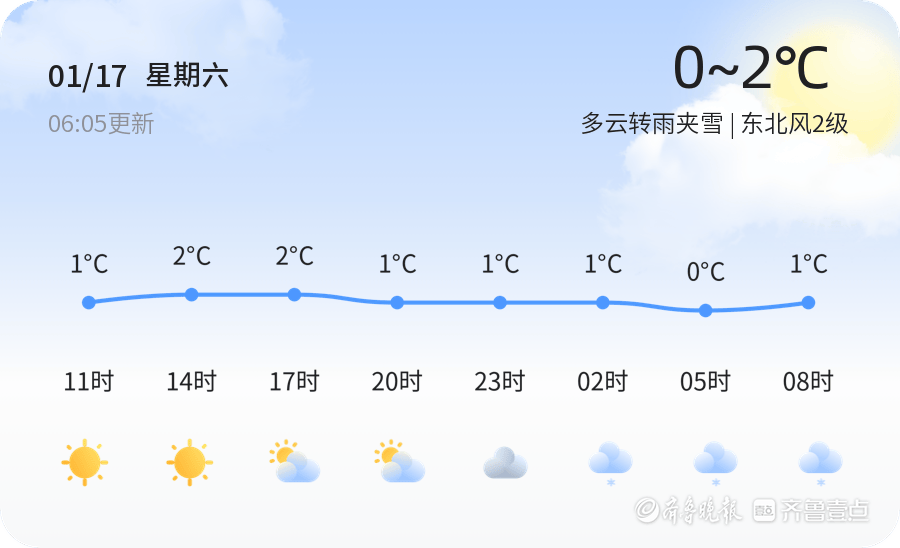 今日是1月17日,星期六,农历十一月廿九云转雨夹雪,气温在0℃至2℃之间,东北风2级,空气湿度为69%,空气质量良好(PM2.5为46)。当前温度为-3.5℃,雨雪天气可能导致路面湿滑,市民出行请注意安全,建议选择合适的交通工具并及时添衣保暖。